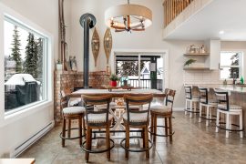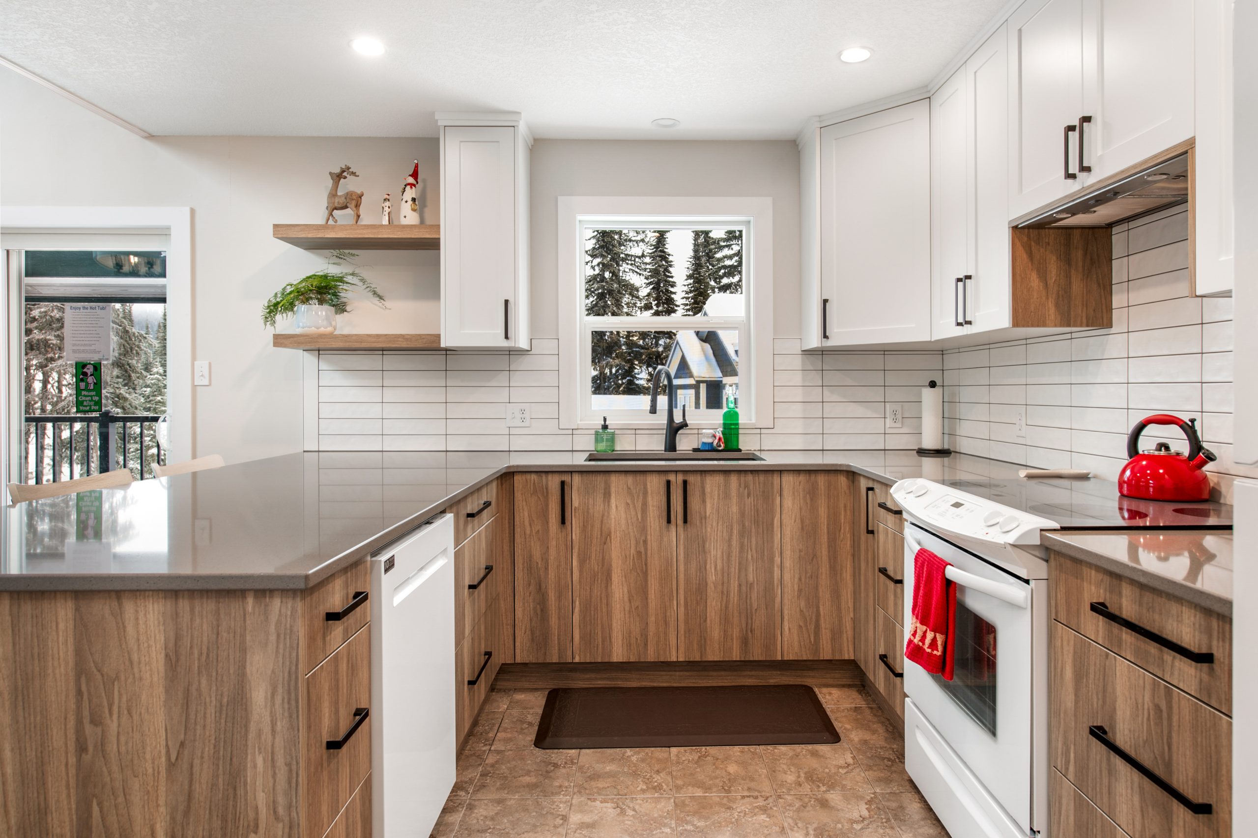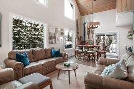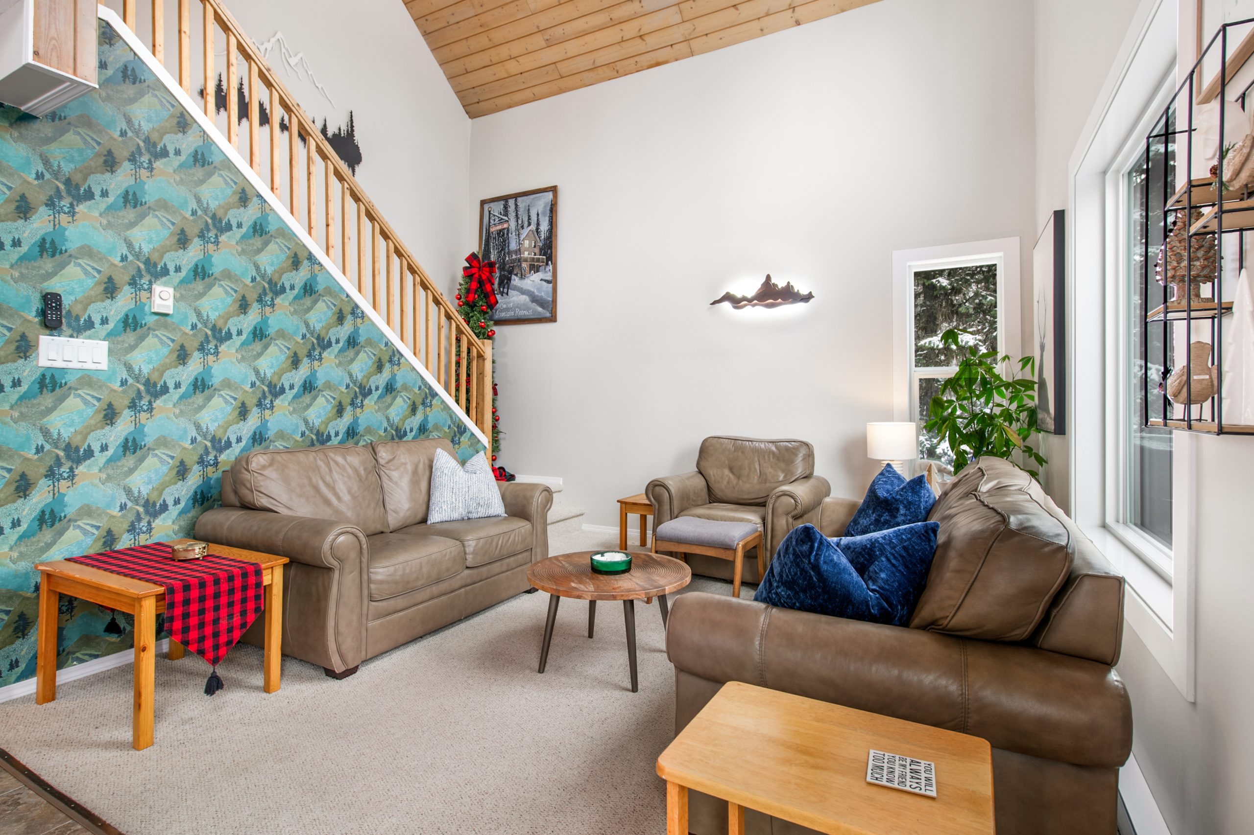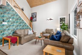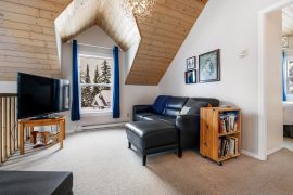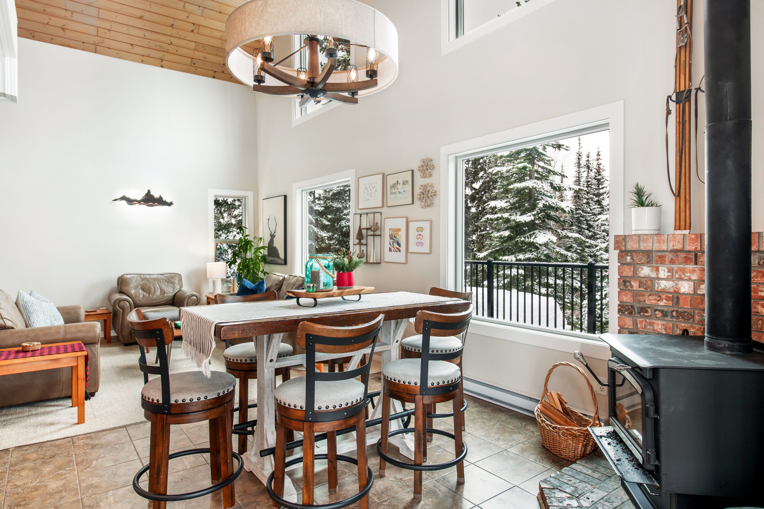 Treeline Lodge has an open and airy living area, cozy up in front of the wood burning fireplace with your morning cup of coffee and take in the mountain views. The main floor has the kitchen, living room and dining room as well as one of the queen bedrooms and a full bathroom. Just off the dining room is the deck with a brand new BBQ and hot tub.