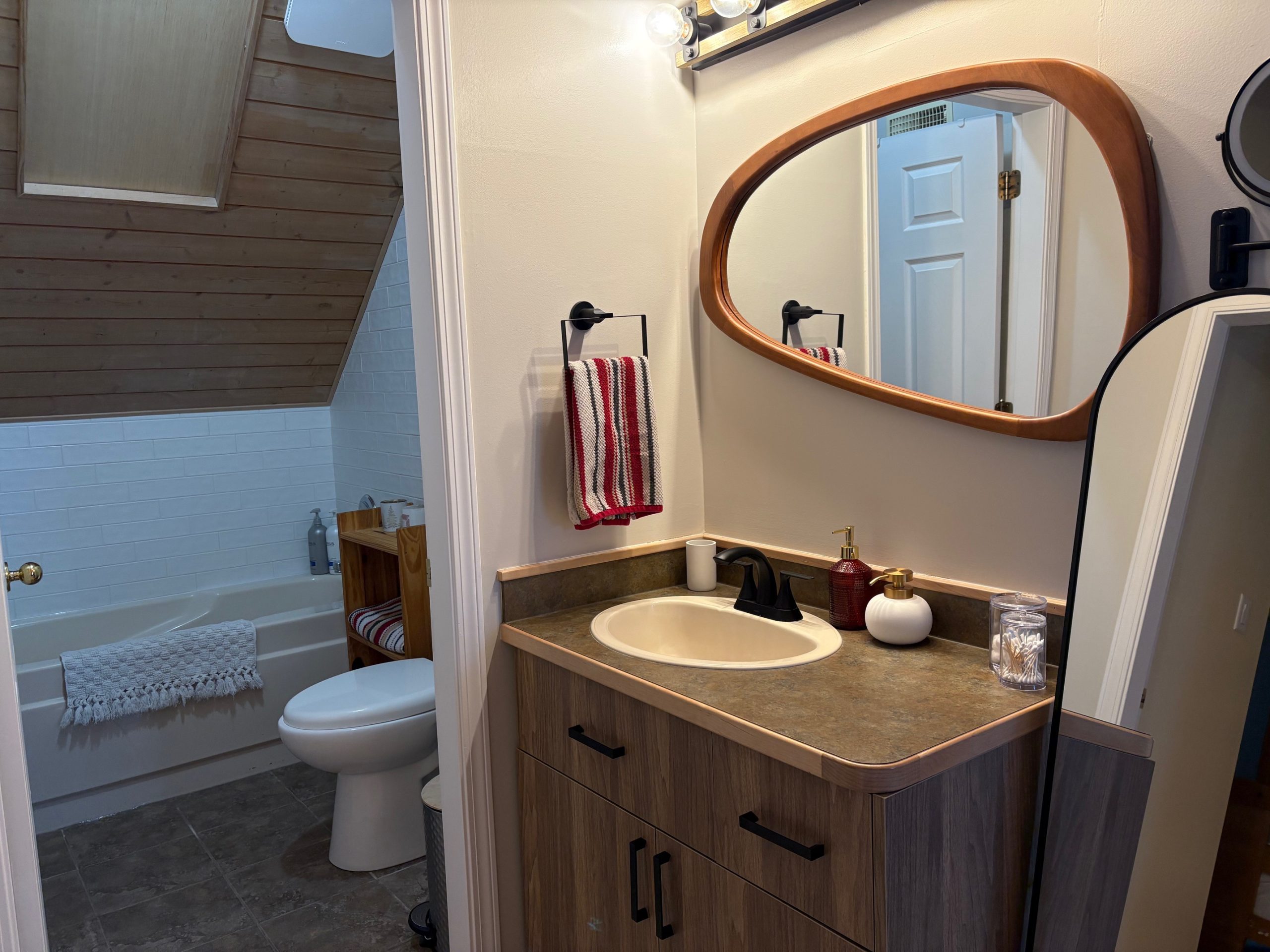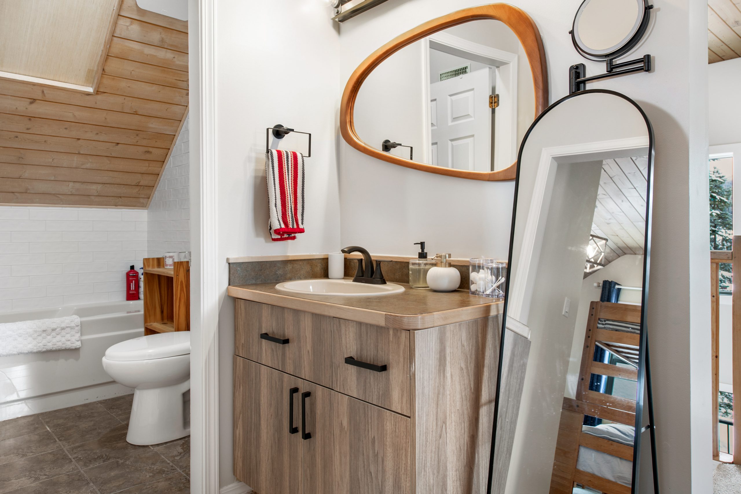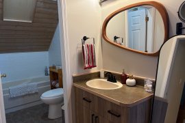 From here, head upstairs to the open loft with a pullout sofa chair and TV – it’s the perfect space for the kids to hang out. This is where you’ll also find the two other bedrooms and full bathroom for the main house.
